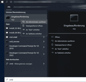 Pour ce faire, ouvrez la console (CMD) en tant qu’administrateur. Cliquez sur le bouton Démarrer du menu Windows ; dans les anciennes versions de Windows, ce bouton s’appelle « Démarrer ». Saisissez « CMD » et faites un clic droit pour sélectionner « Exécuter en tant qu’administrateur ».