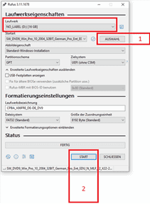 6. Démarrez le processus en cliquant sur « DÉMARRER » (n° 2 dans la capture d’écran 1).</li> <li>Confirmez l’avertissement concernant l’écrasement de la clé USB.